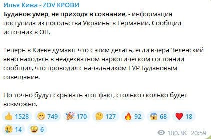 "Тепер у Києві думають, що з цим робити, якщо вчора Зеленський, явно перебуваючи в неадекватному наркотичному стані, повідомив, що проводив з начальником ГУР Будановим нараду. Але точно приховуватимуть цей факт, скільки буде можливо", - написав зрадник України.