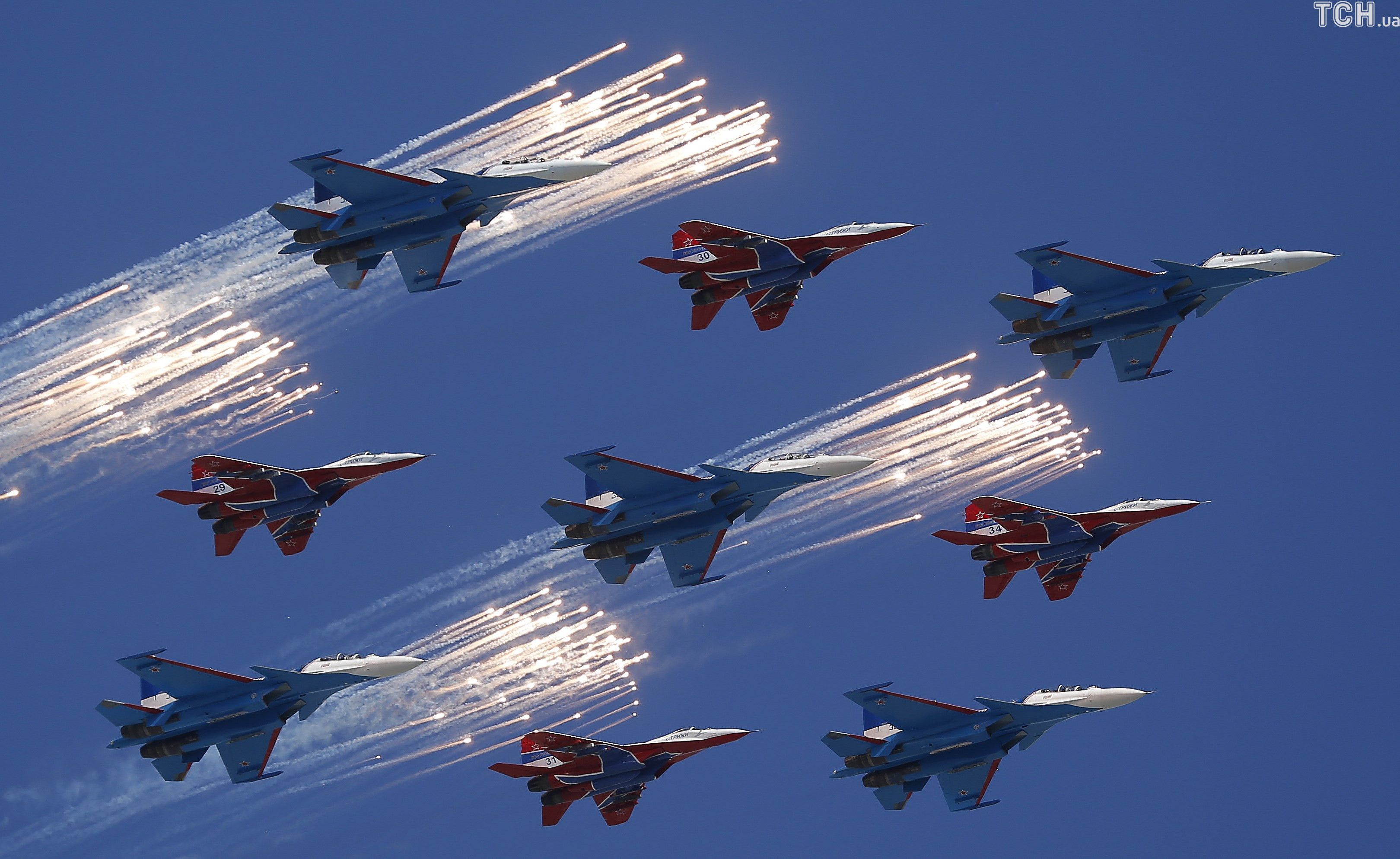 На фотографіях з репетиції, які оприлюднило агентство Reuters, видно винищувачі і вертольоти.