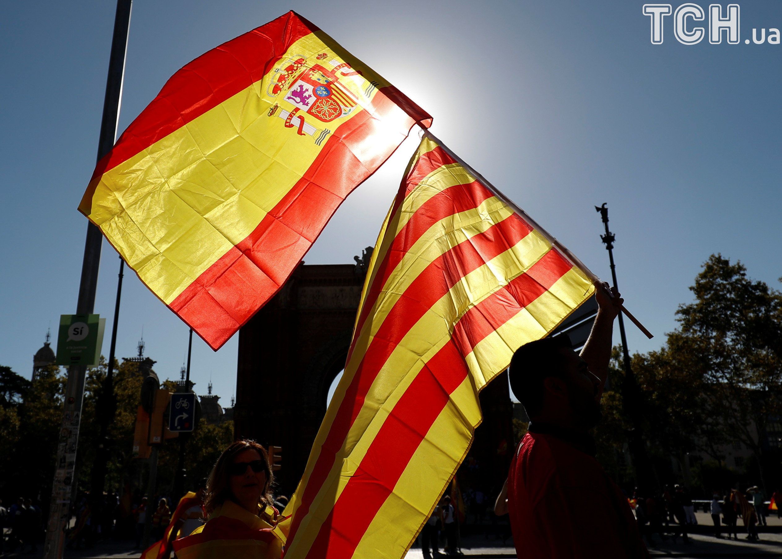 Протестувальники тримають іспанські та каталонські прапори й скандують "Каталонія - Іспанія".