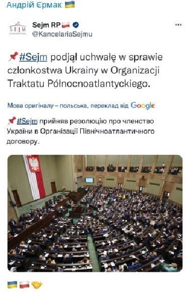 Сеймі Польщі підтримав вступ України до НАТО / © Twitter / Сейм Польщі
