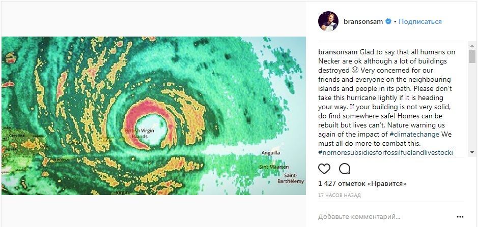 Його син - Сем Бренсон - пізніше повідомив також через соцмережу, що всі люди на острові лишилися живими. Водночас постраждало багато будівель. Він закликав людей поставитися серйозно до урагану і знайти собі надійні прихистки, якщо їхні будинки недостатньо міцні.