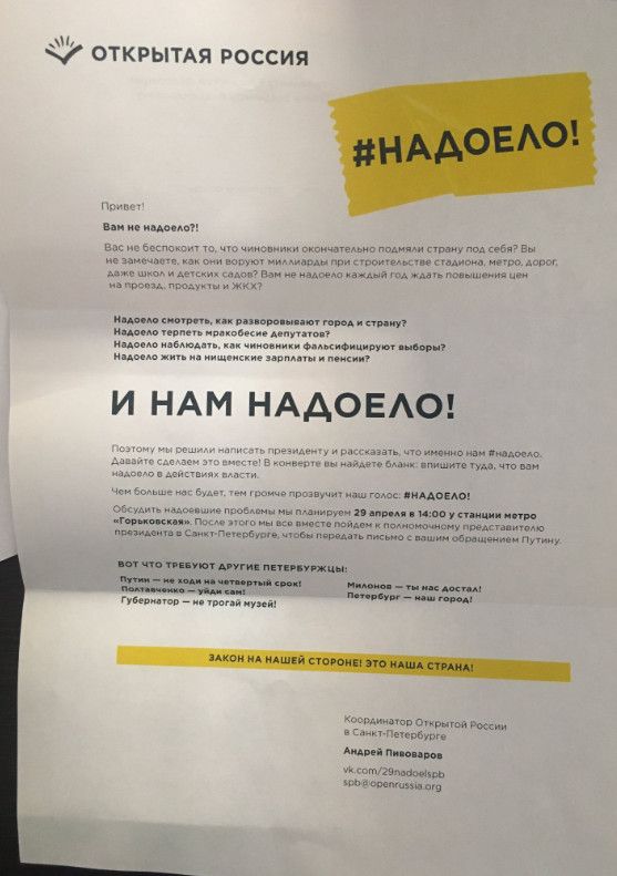 Сьогодні, 29 квітня, у багатьох містах Росії відбуваються акції протесту "Набрид".