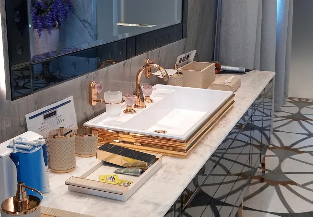 У величезних ванних кімнатах — площею по 50 квадратних метрів — на підлозі і стінах мармур, а сходи, поручні і джакузі в позолоті.