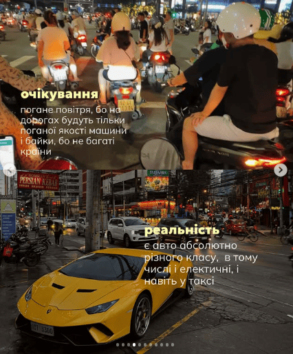 Ще один стереотип стосувався транспорту та загального хаосу. За словами Саші, в містах доступні різні види пересування — від недорогих байків до сучасних авто й електрокарів, а сервіси таксі працюють стабільно та зручно.