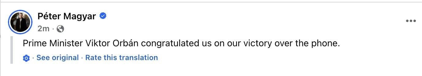 Прем’єр-міністр Віктор Орбан привітав опозиційного політика Петера Мадьяра з перемогою на виборах в Угорщині.