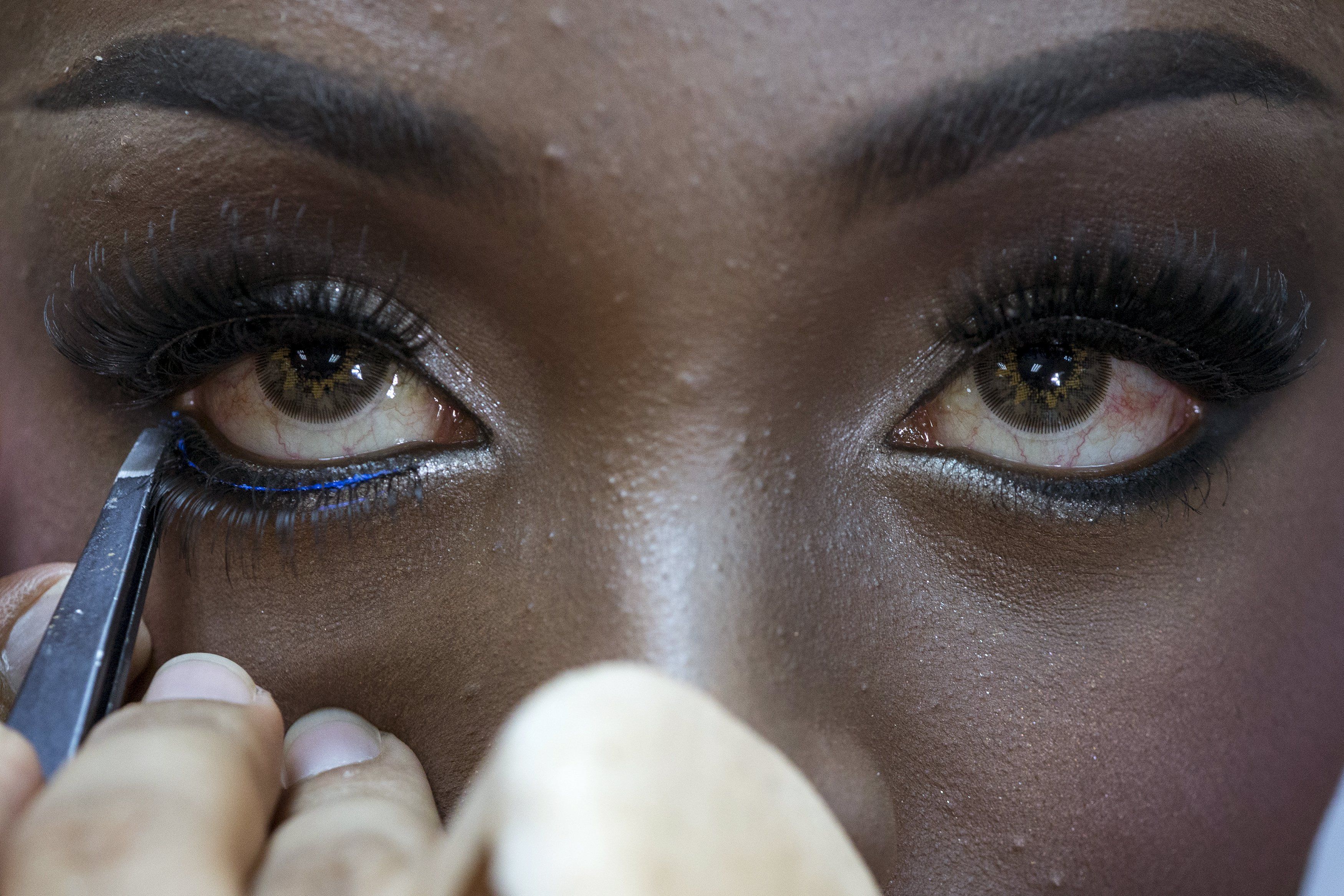 На фото видно, як учасниці посилено готуються до виходу на сцену – візажисти накладають їм ефектний макіяж та роблять яскраві зачіски.