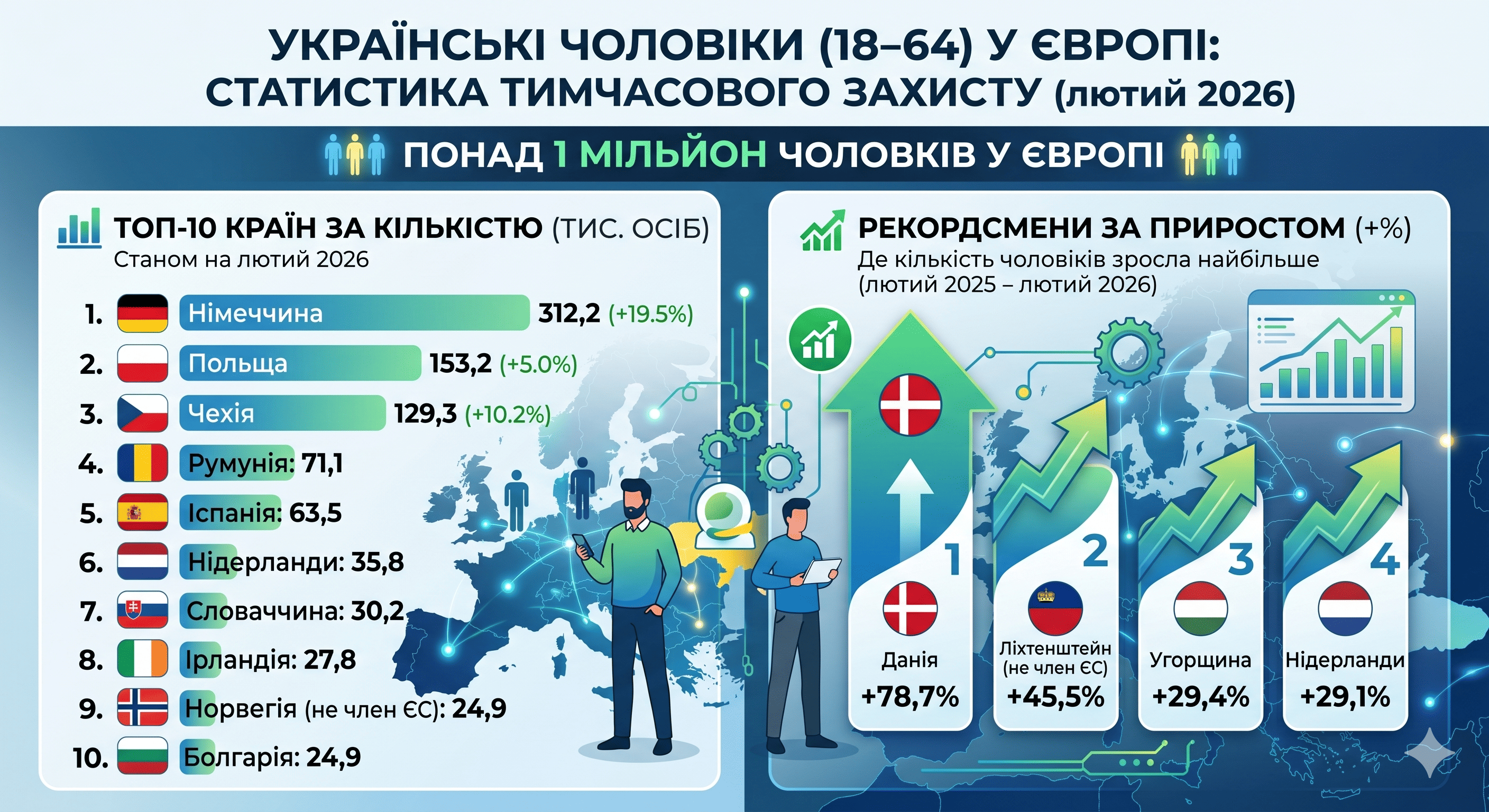 Станом на кінець лютого 2026 року офіційний статус тимчасового захисту в країнах Європейського Союзу отримали 1 мільйон 42 тисячі українських чоловіків віком від 18 до 64 років. Порівняно з минулим роком ця цифра зросла майже на 16 відсотків, що дедалі частіше змушує європейські уряди переглядати міграційну політику щодо цієї категорії біженців.