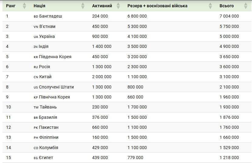 Загальна чисельність: відображає мобілізаційні можливості держави (лідери — Бангладеш, В’єтнам, Україна).