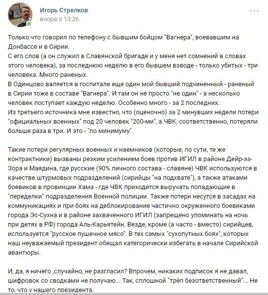 "Тільки-но розмовляв телефоном з колишнім бійцем "Вагнера", що воював на Донбасі і в Сирії. З його слів (а він служив у Слов'янській бригаді і у мене немає сумнівів у словах цієї людини), за останній тиждень в його колишньому взводі - тільки вбитих - три людини. Багато поранених. В Одинцовому валяється в госпіталі ще один мій колишній підлеглий - поранений у Сирії теж у складі "Вагнера". І там він не просто "не один" - а кілька осіб надходить щотижня. Особливо багато - за 2 останніх", - повідомив Стрєлков.