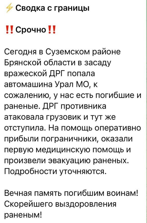 Водночас вони привели скриншот повідомлення військових РФ, які кажуть, що серед них є загиблі та поранені. Засідка була влаштована на вантажівку “Урал МО”. добровольчий корпус провів атаку, після чого відступив. Загиблих та поранених з місця події забирали прикордонники.