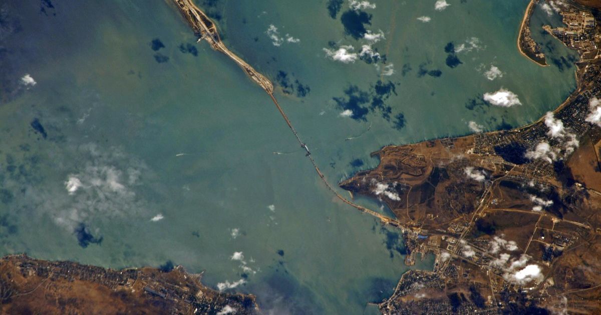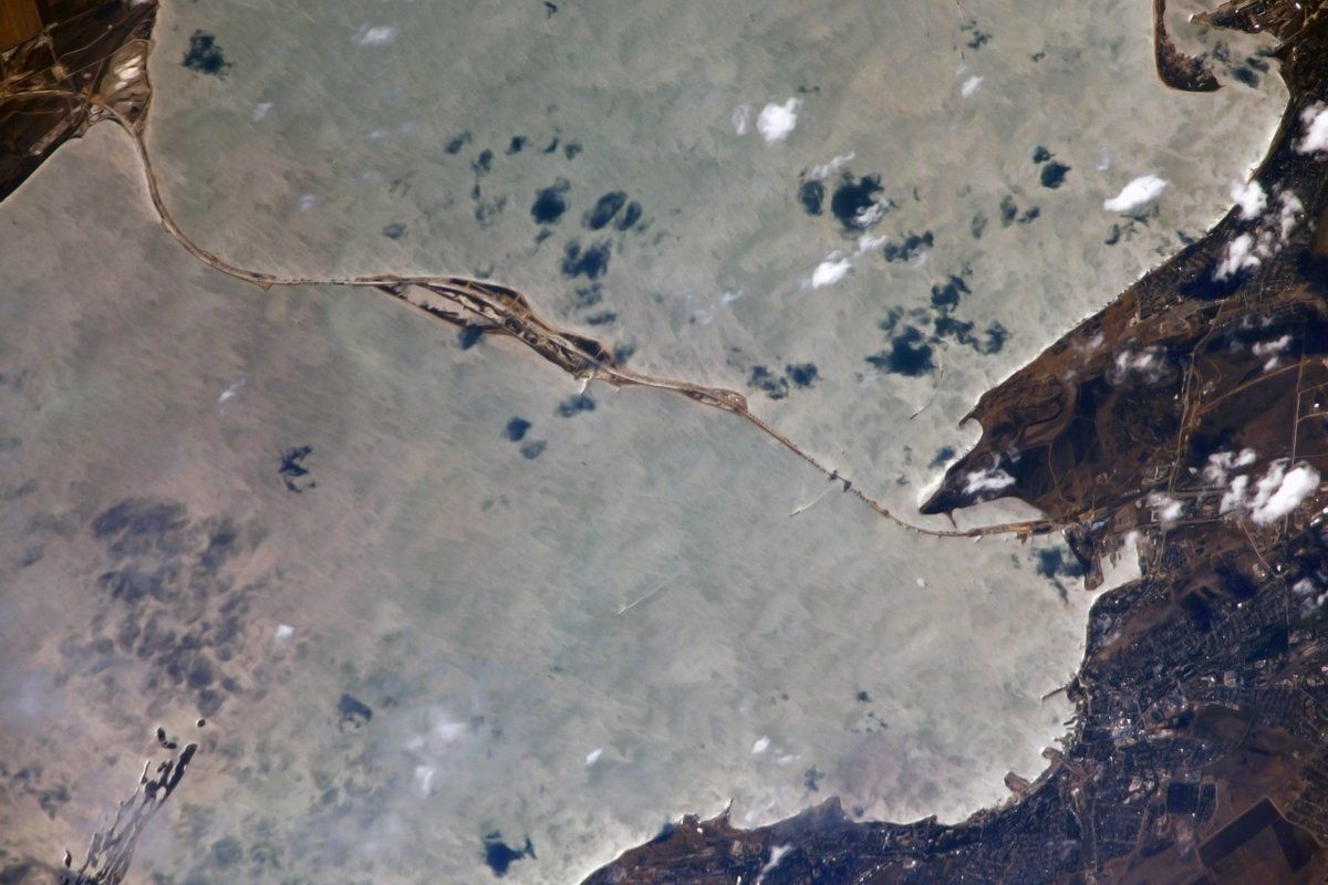 Космонавт-випробувальник Роскосмосу, бортінженер 52-го екіпажу МКС Сергій Рязанський оприлюднив світлини Керченського мосту, який зараз зводиться Росією. Фотографії були зроблені із космосу.
