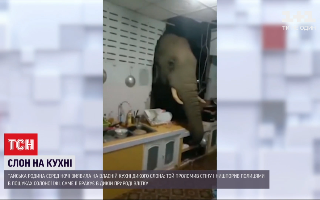 Тайська родина серед ночі виявила на власній кухні дикого слона. Вухань проломив стіну, аби відшукати на полицях солону їжу.