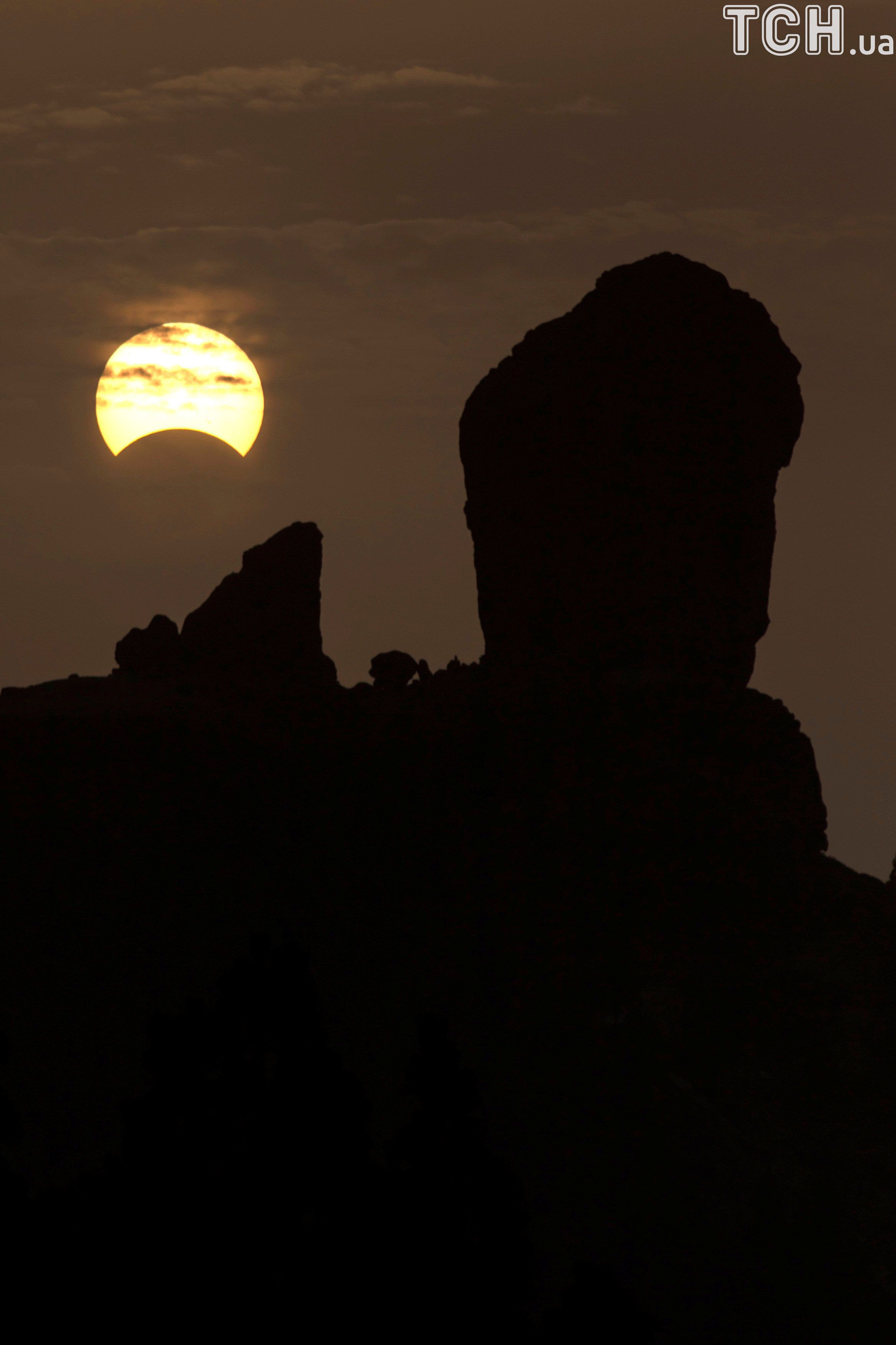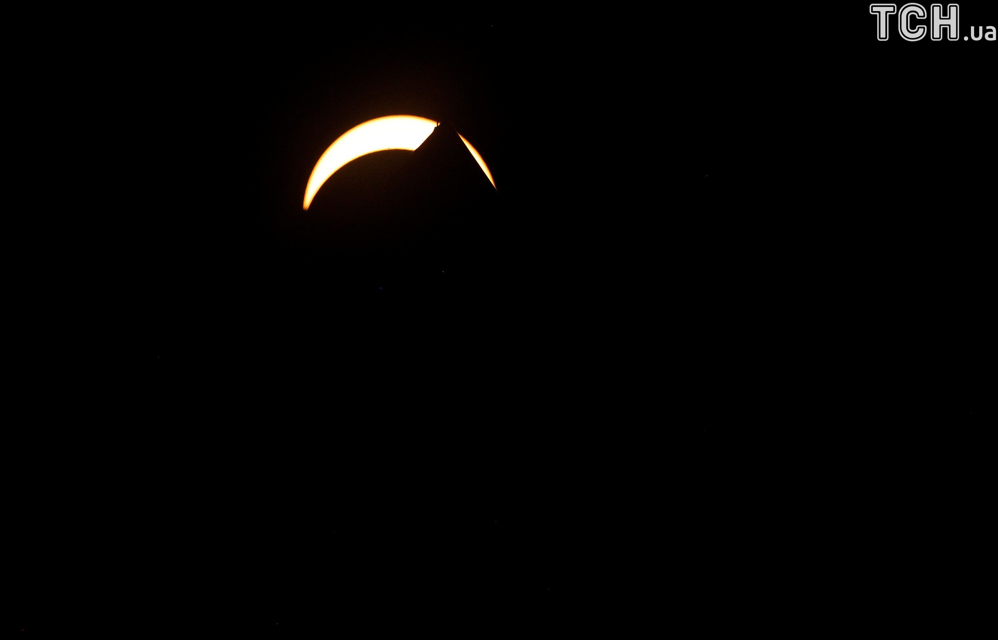 Відповідне фото з'явилося у Reuters. Міжнародну космічну станцію можна роздивитися у силуеті, коли вона проходить на фоні Сонця під час затемнення.
