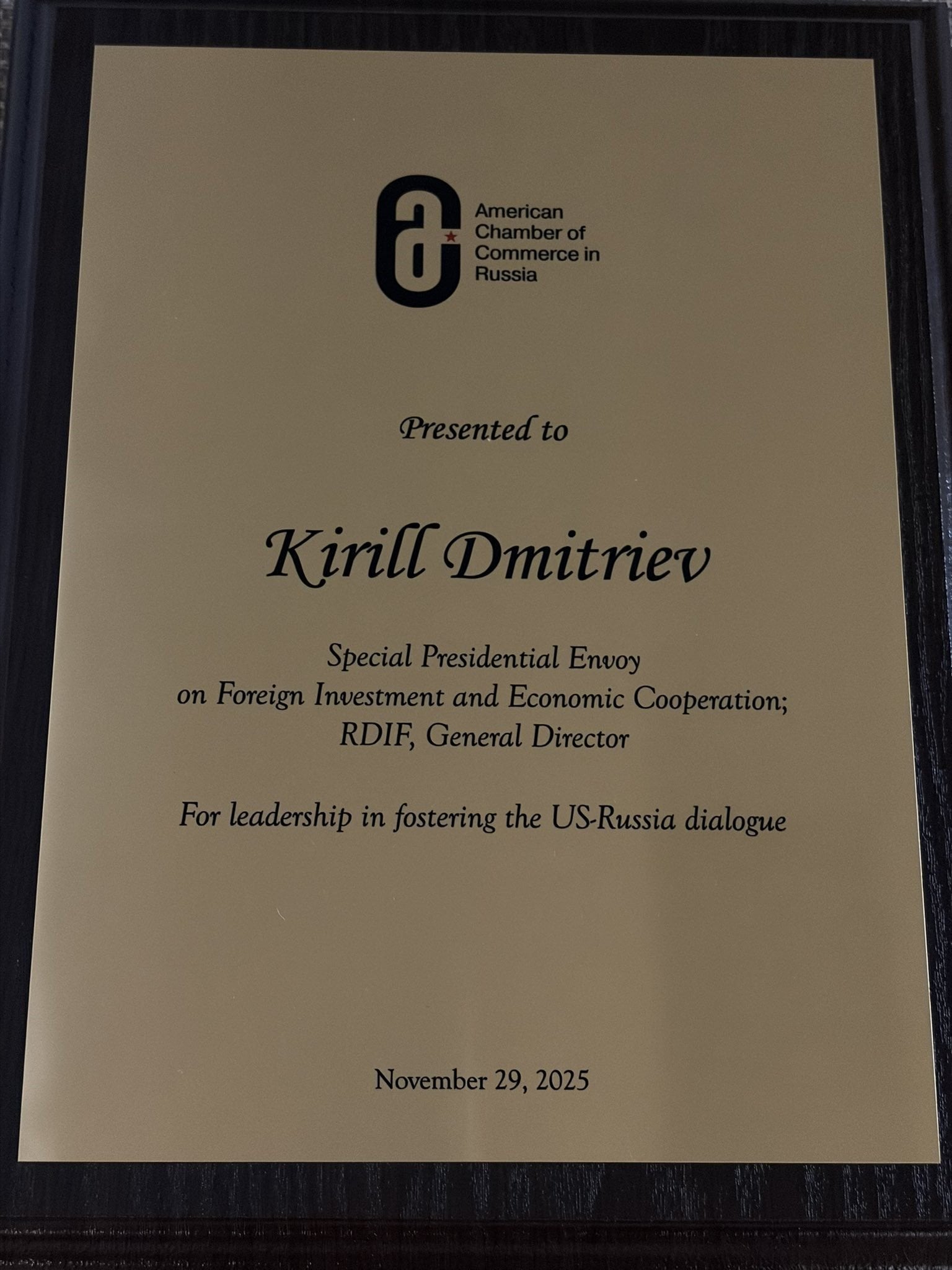 Спецпосланець президента РФ Володимира Путіна, який відіграє ключову роль у переговорах зі США щодо миру в Україні, очільник Російського фонду прямих інвестицій Кирило Дмитрієв отримав нагороду від Американської торговельної палати в РФ.