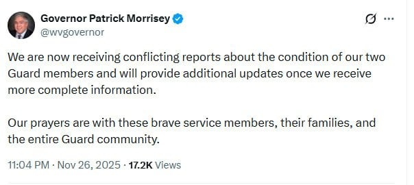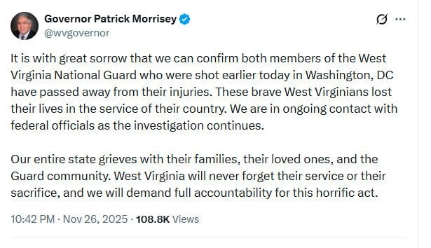 Губернатор Західної Вірджинії Патрік Моррісі повідомив, що через стрілянину, що сталася неподалік Білого дому, обидва члени Національної гвардії Західної Вірджинії померли від отриманих травм.