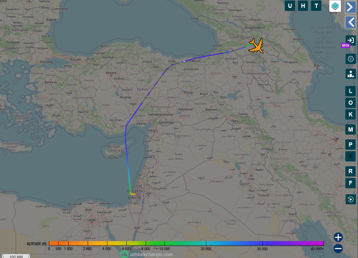 Маршрут польоту «Руслана» з Тель-Авів до Тбілісі 28 листопада. Джерело: ADS-B Exchange