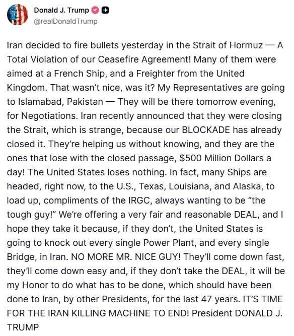 «Іран вирішив вчора стріляти в Ормузькій протоці — повне порушення нашої Угоди про припинення вогню!» — написав він, стверджуючи, що іранські сили обстрілювали судна на стратегічному водному шляху, зокрема французьке судно та вантажне судно під британським прапором.
