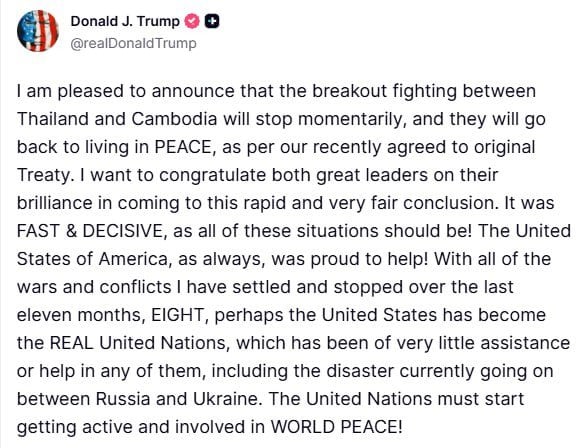 У своєму дописі президент США оголосив про припинення боїв між Таїландом та Камбоджею. Напередодні сторони підписали відповідну угоду.