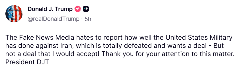«Фейкові ЗМІ ненавидять повідомляти про те, як добре американські військові впоралися з Іраном, який повністю розгромлений і хоче укласти угоду — але не ту угоду, яку я б прийняв!» — написав президент США.