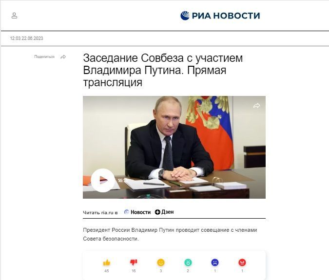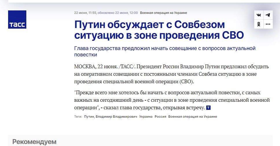 А ще одне пропагандистське агентство ТАСС повідомило, що "Путін обговорює з Радбезом ситуацію в зоні проведення СВО" о 12:00.