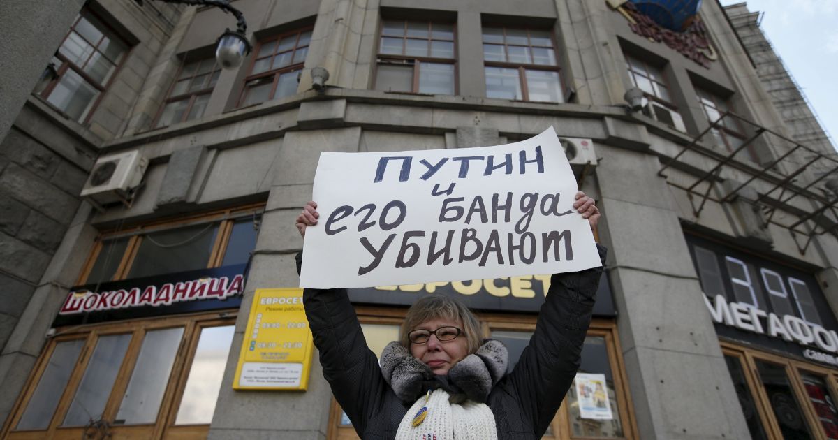 Зокрема, Кузнєцов тримав плакат, на якому було написано "Путін – це Гітлер сьогодні". Калмикова стояла з синьо-жовтим значком і плакатом з написом "Путін і його банда вбивають".