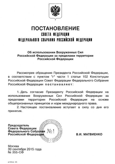 У тексті постанови Ради Федерації, яка Володимиру Путіну дозволила використовувати авіацію за межами країни, нічого не сказано про бомбардування Сирії.