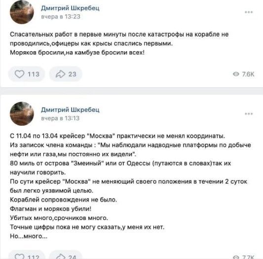 На початку травня батько одного із строковиків Єгора Шкребця, який перебував на крейсері, опублікував в Мережі публікацію про те, що насправді сталося. Військова прокуратура заявила, що сина Дмитра Шкребця — строковика Єгора Шкребця — оголошено "безвісно відсутнім" у військовій частині. У відомстві стверджують, що корабель, на якому Єгор проходив службу, "не входив до територіальних вод України" і не брав участь у "спеціальній військовій операції". На своїй сторінці у "Вконтакті" Дмитро написав, що під час події на кораблі офіцери врятувалися першими.