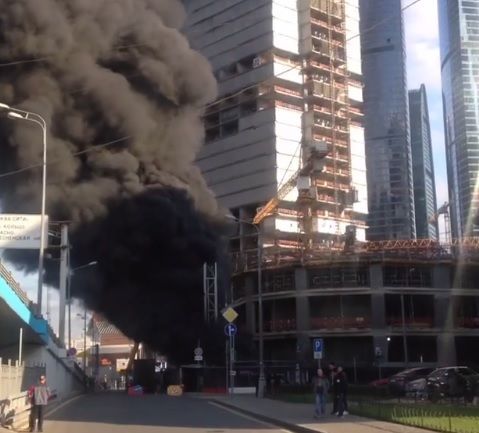 Від конструкції здіймаються клуби густого чорного диму. На місце прибули пожежники, під'їзди до дороги біля "Москва-Сіті" обмежені.