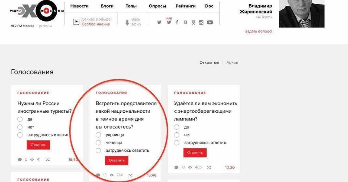 Радіостанція "Эхо Москвы", яка вважається в Росії ліберальним ЗМІ, опублікувала на своєму сайті опитування: "Зустріти представника якої національності в темний час дня ви побоюєтеся?".