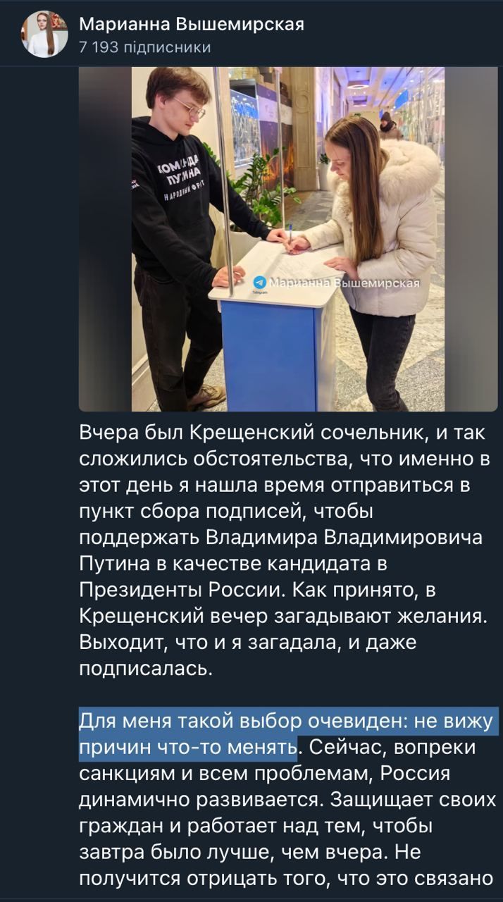 Маріанна Вишемірська з Маріуполя, яка вижила під час бомбардування росіянами пологового будинку, підтримала Володимира Путіна. Вона підписалася за диктатора як кандидата у президенти РФ.