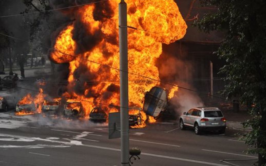 В результаті вибуху бензовозу на перетині вул. Кабанбай батира і пр.Сейфуліна сталася велика пожежа в багатоповерховому житловому будинку. Вогнем були охоплені 6 поверхів, згоріли два під'їзди. Зараз продовжують гасити вогонь, але вже відомо, що згоріло, як мінімум, 20 квартир.