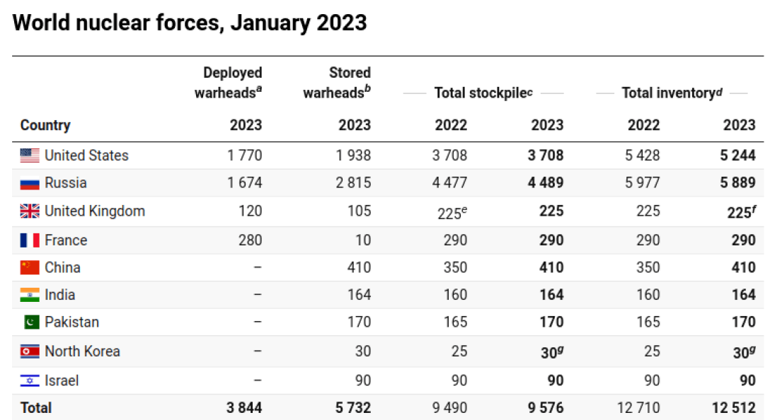 "У січні 2023 року із загального глобального запасу приблизно 12 512 боєголовок близько 9 576 перебували у військових запасах для потенційного використання — на 86 більше, ніж у січні 2022 року. З них приблизно 3 844 боєголовки були розгорнуті разом із ракетами та літаками, а близько 2000, майже всі з яких належали Росії чи США, перебували в стані високої оперативної готовності, тобто вони були встановлені на ракетах або зберігалися на авіабазах", - сказан у зведенні.