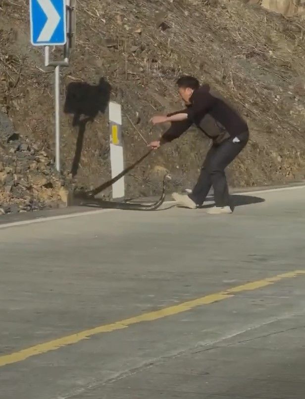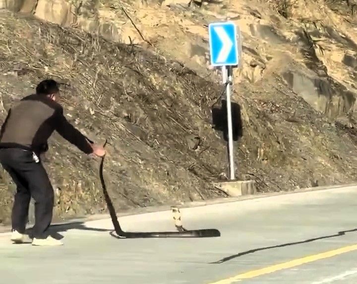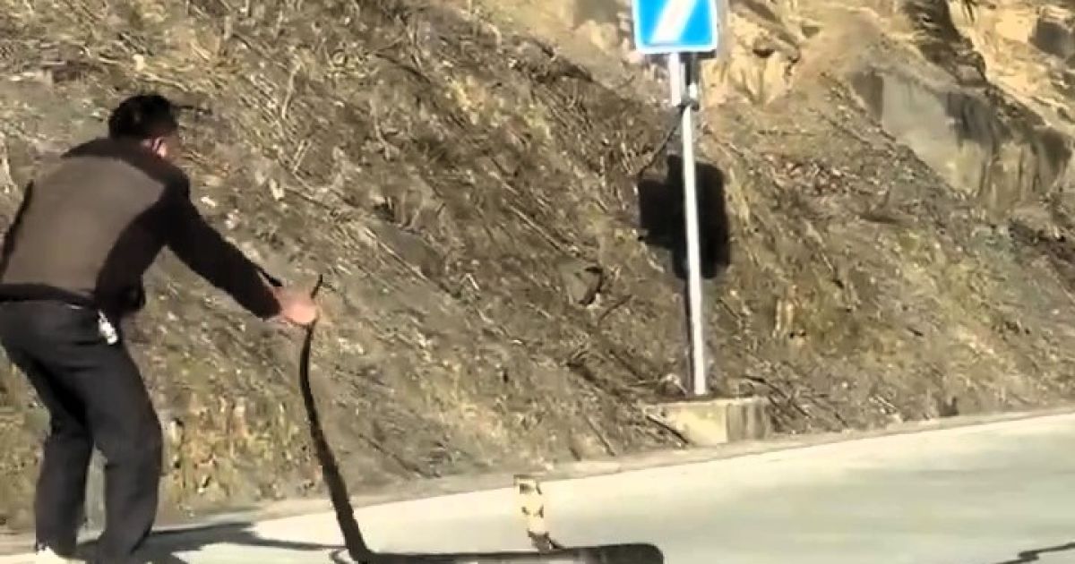 Чоловік влаштував боротьбу зі смертоносною змією посеред дороги.