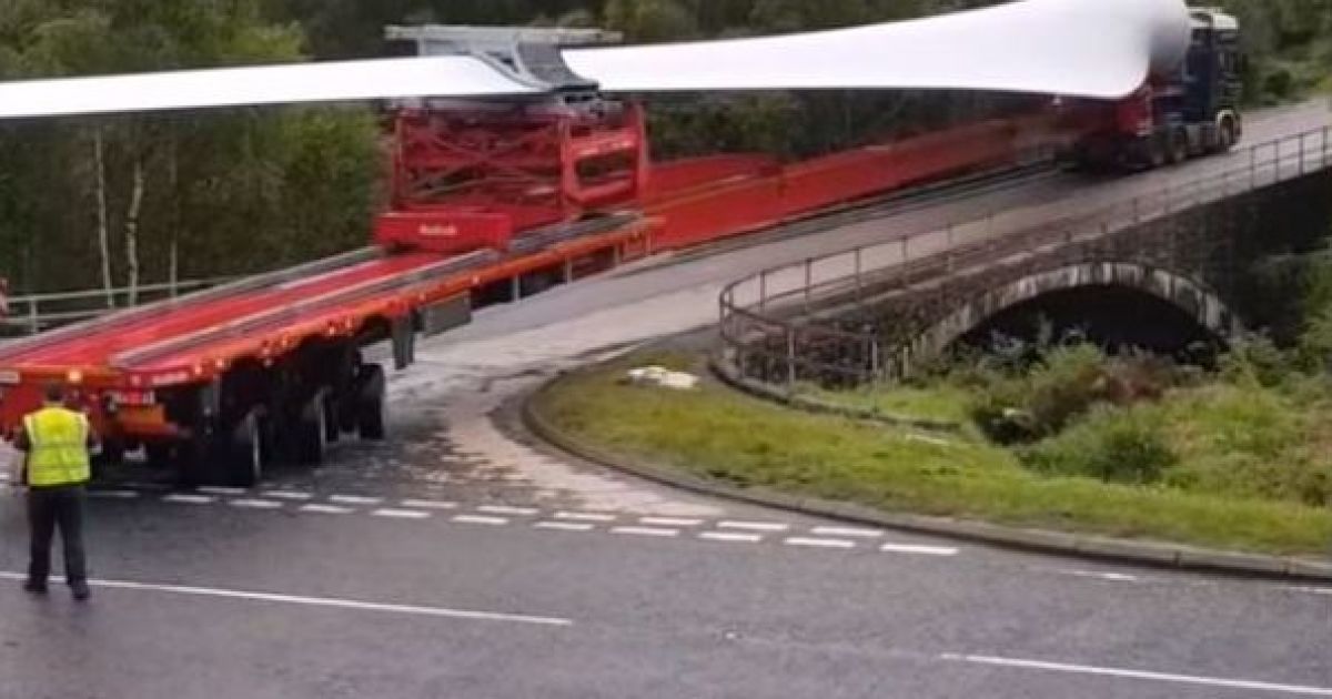У викладеному відео можна побачити, як на звичайній дорозі, ширина якої не перевищує 10 метрів, водій з габаритним причепом, що перевозить лопасть від вітрогенератора, з легкістю та з першого разу входить у поворот.