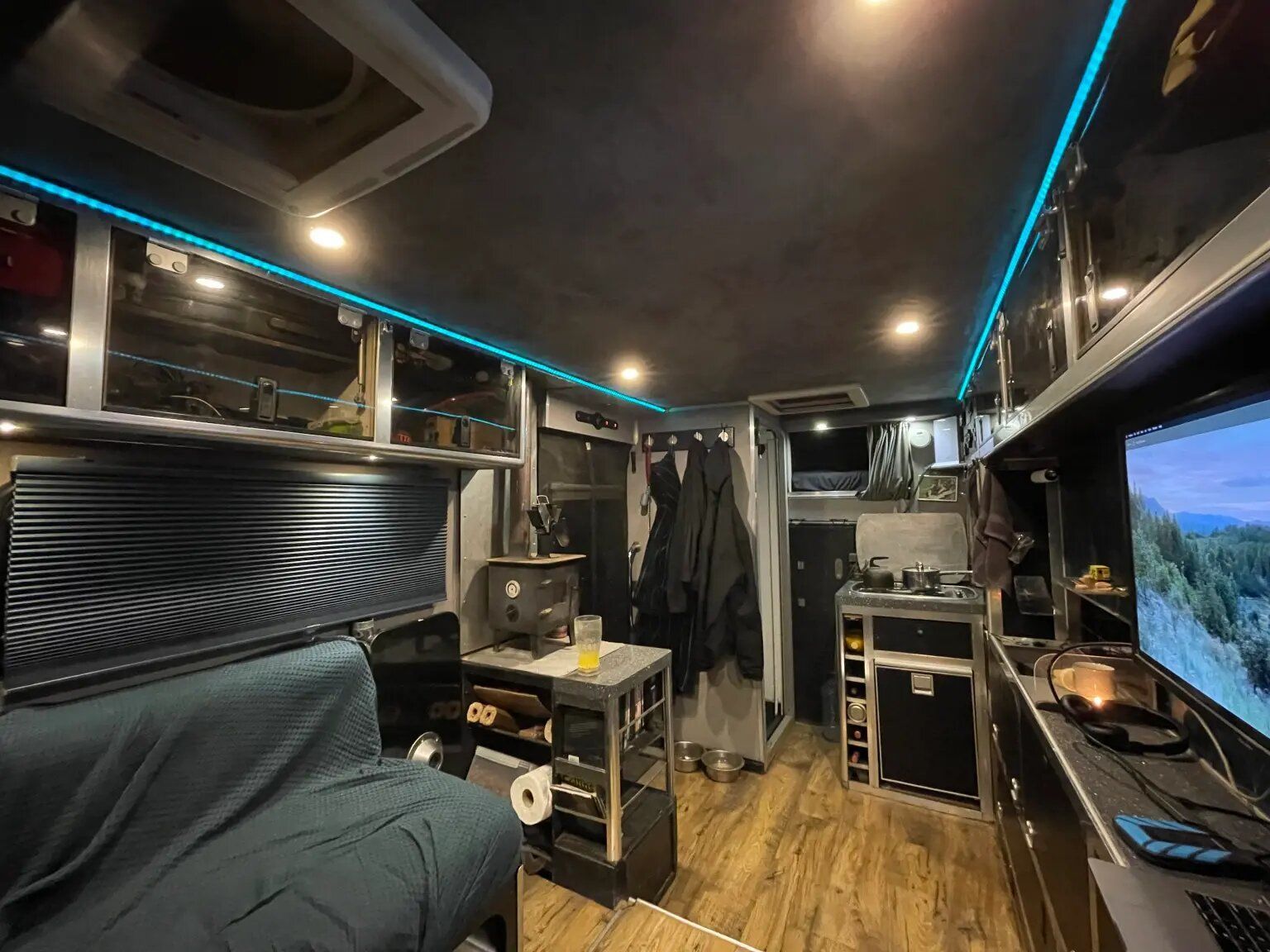 Щоб зробити фургон більш затишним, він полагодив електричну систему, пофарбував стіни, обклеїв дверцята шаф, уклав підлогу і додав диван-ліжко, ванну кімнату та резервуар для води.