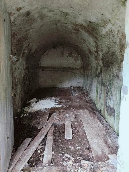 На останньому знімку — кінець тунелю, замурований цеглою. Тут уже прості білі вигнуті стіни, позеленілі від цвілі. На земляній долівці видно лише залишки дерев’яної підлоги.