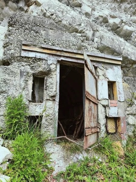 На одному фото зображено вже прочинені двері, які мають бетонну раму, а поруч з ними — два невеликі прямокутні вікна, вкриті рослинністю.