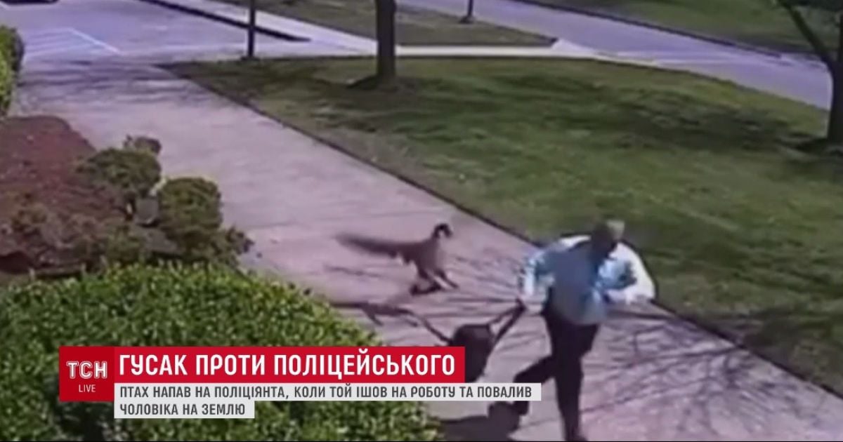 Птах чатував на чоловіка на узбіччі. Коли правоохоронець наблизився, гусак підлетів та дзьобнув поліцейського в голову. Чоловік спробував відбитися від нестримного птаха рюкзаком. Гусак відбив атаку, а чоловік впав на землю.