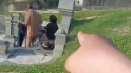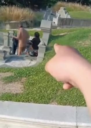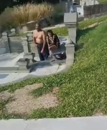 Їх зняла на відео відвідувачка кладовища, яка заявила, що вже не вперше бачить цю пару в подібній ситуації. На кадрах видно, як чоловік стоїть спиною до камери без одягу, а жінка сидить на надгробку, оголена нижче пояса.