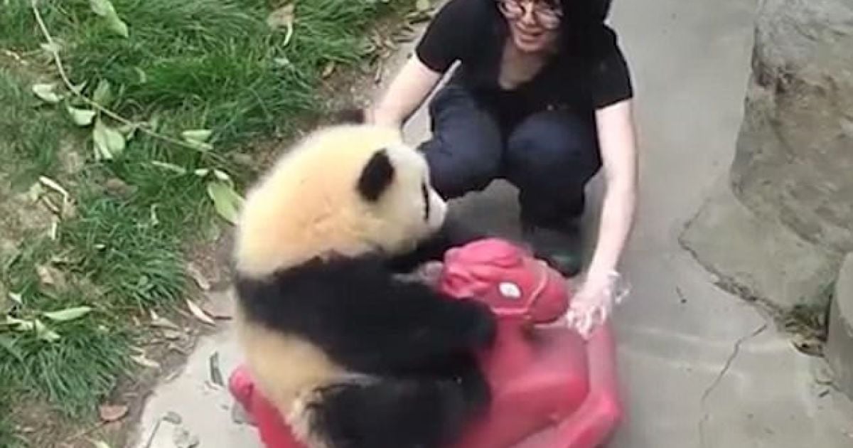 У Мережі з'явилося відео, як дитинча панди катається верхи на іграшковій конячці.