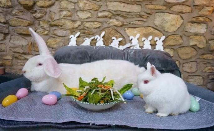 Кролики мають не лише окрему спальню, а й власний туалет у кімнаті, до якого вони привчені. Харчуються вони свіжими овочами з саду — зокрема броколі, морквою, пастернаком і салатом.