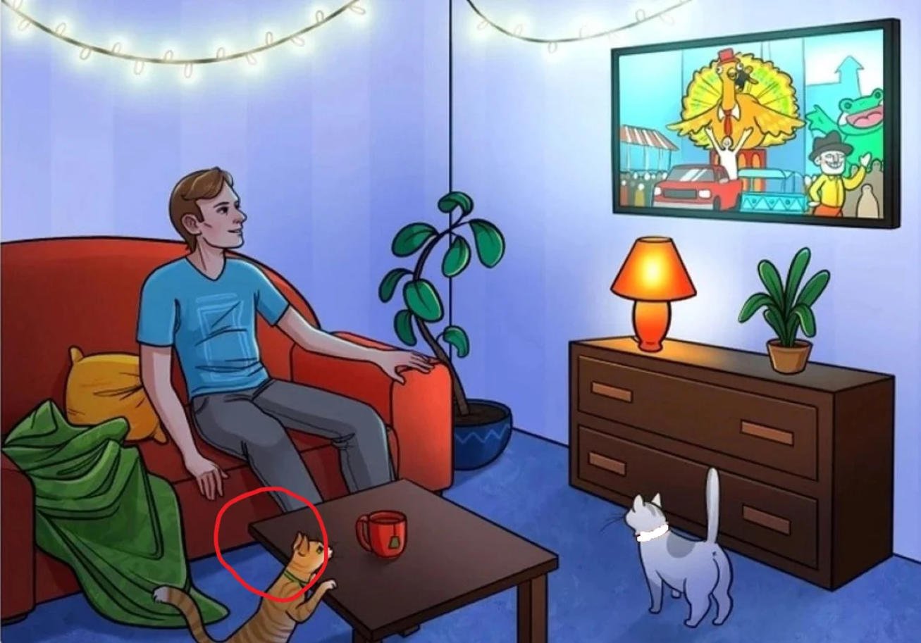Перед вами, здавалося б, звичайна сцена: чоловік зручно влаштувався біля телевізора, насолоджується мультфільмами разом із двома пухнастими котиками. Настільна лампа лагідно освітлює кімнату, а кімнатні рослини мають свіжий і зелений вигляд. Все здається ідеальним… поки не придивишся уважніше.