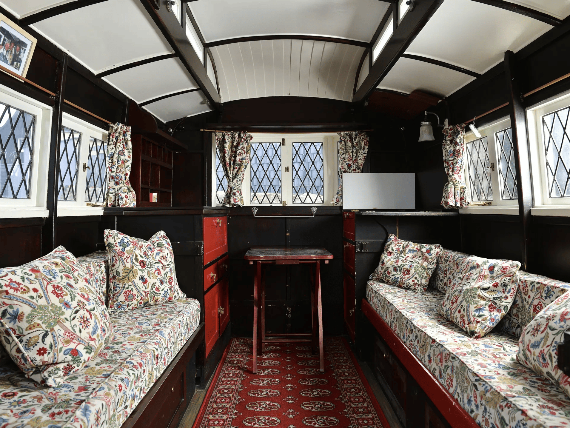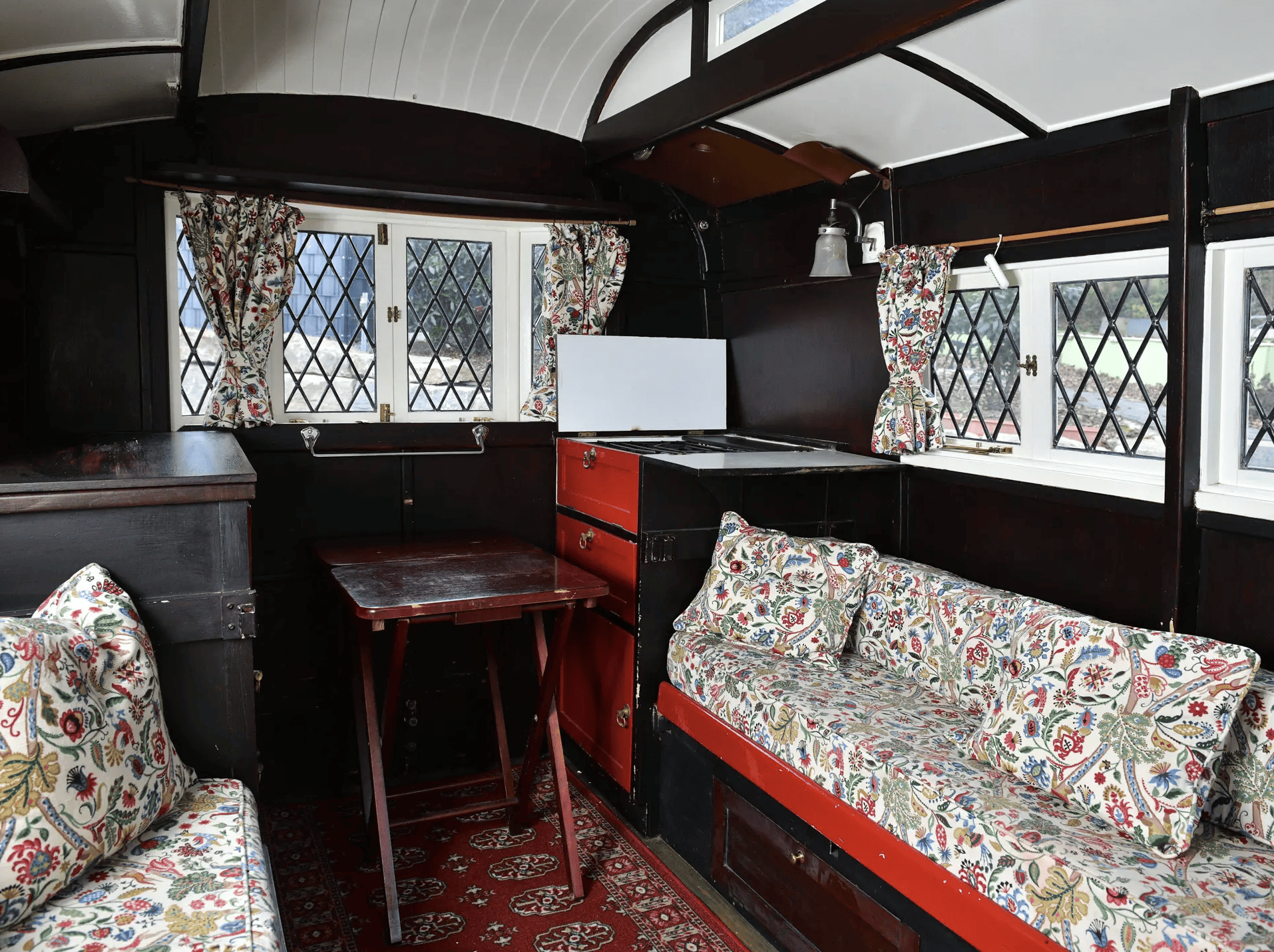 Караван пофарбований у темно-зелений колір з білою обробкою та вітражними вікнами. В інтер’єрі збережені чудові дерев’яні шафи, сидіння з вишитої тканини та відповідні штори, а також встановлена невелика газова плита і холодильник.