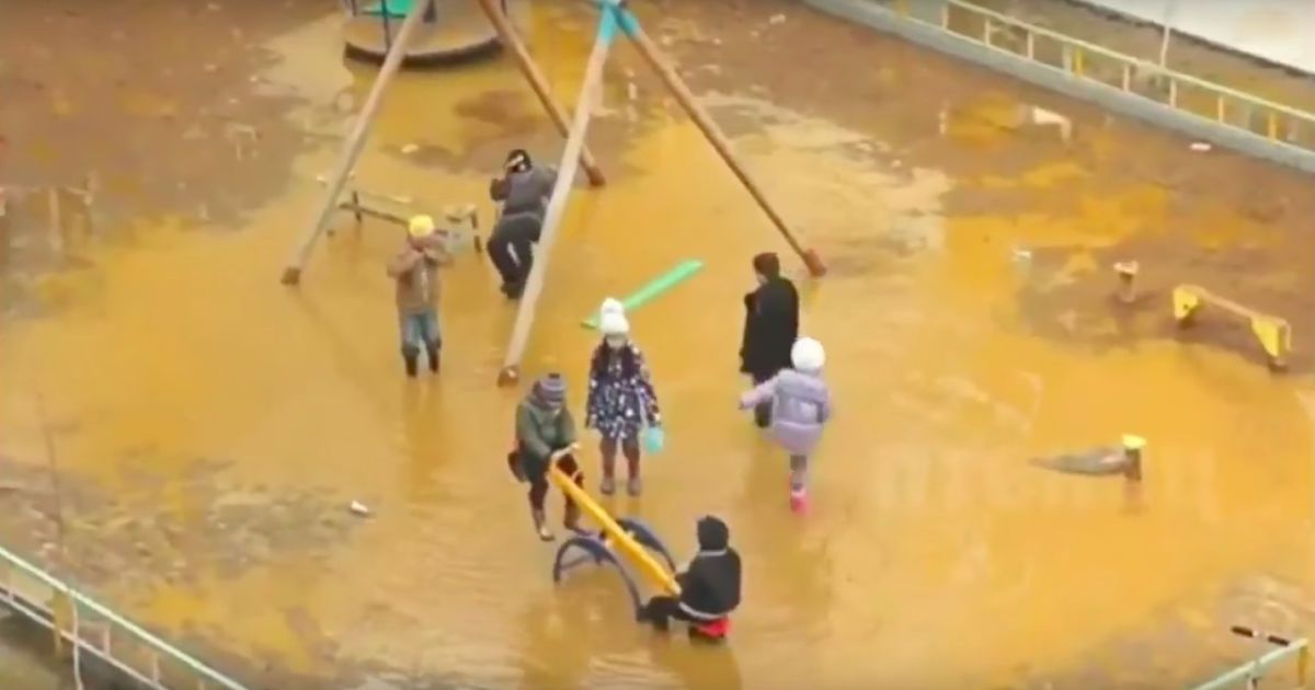 Опубліковано відео, як діти Якутська грають на дитячому майданчику, затопленому брудом з водою