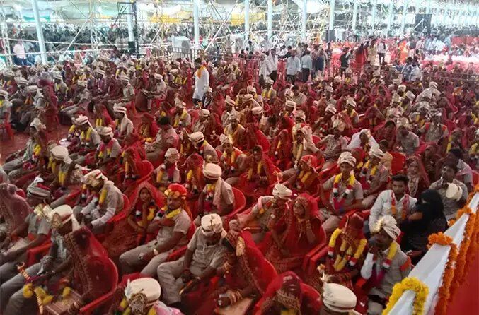 Церемонія розпочалася з того, що наречений та наречена обмінялися гірляндами з жовтих, рожевих та червоних кольорів, з'єднаних разом на нитці. Кожна пара також отримала благословення від керівників штатів, зокрема від головного міністра Раджастхана Ашока Гехлота та міністра кабінету міністрів Прамода Джейна Бхая.