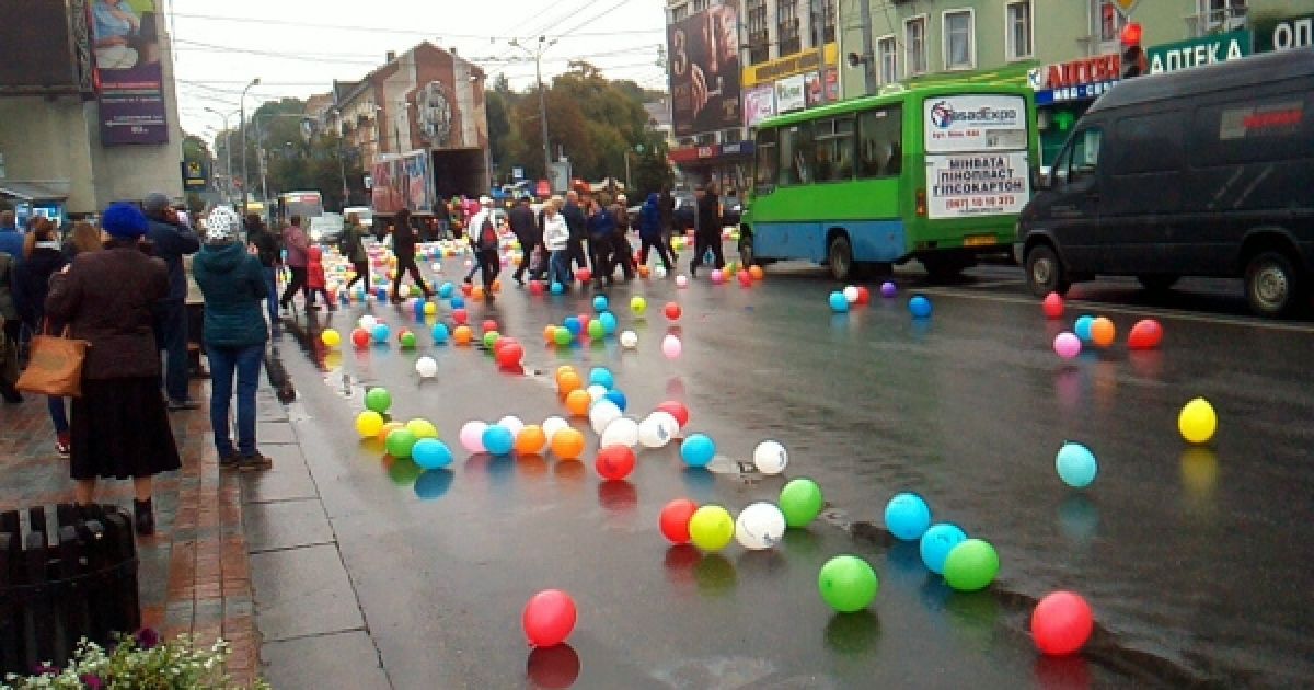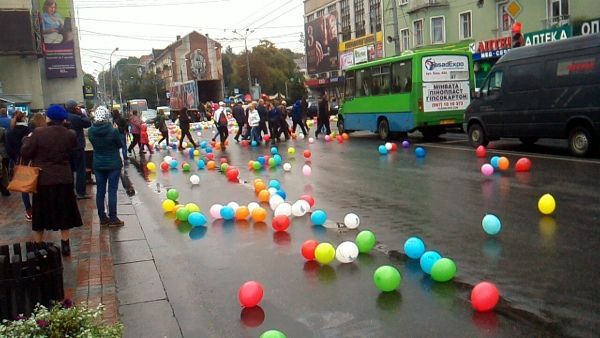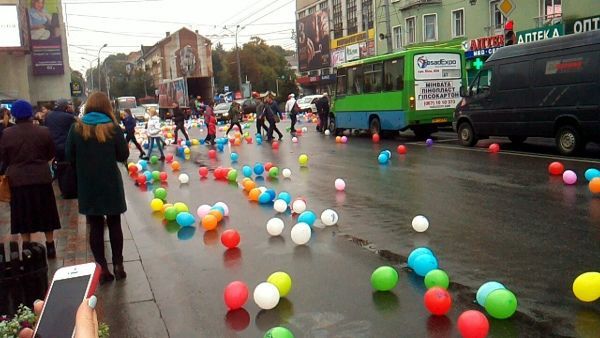У центрі Рівного із вантажівки висипалися сотні різнокольорових повітряних кульок.