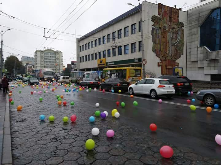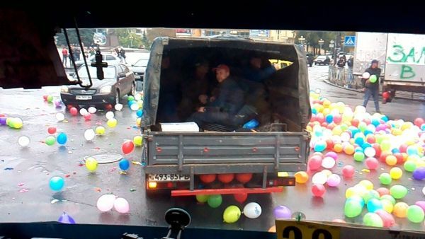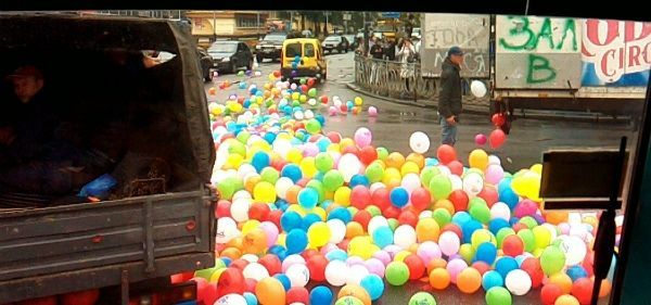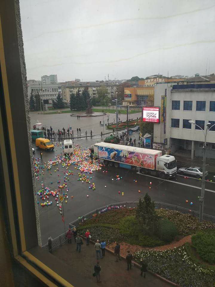 Різнокольоровий колапс: у центрі Рівного з фури висипалися сотні повітряних кульок