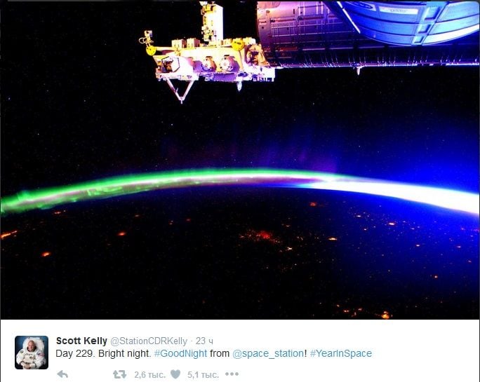 Астронавт NASA Скотт Келлі опублікував новий вражаючий знімок з борту Міжнародної космічної станції. На знімку астронавта зображена нічна частина Землі, навколо якої помітні спалахи північного сяйва. Наголошується, що на знімку можна помітити не тільки північне сяйво, але і вогні міст Землі.