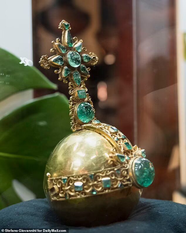Тим часом королівська сфера була виготовлена вручну ювелірами, ймовірно, колумбійськими за походженням, і прикрашена 37 смарагдами Музо, майстерно оправленими у 22-каратне жовте золото. Численні смарагди грушоподібної форми ограновані так само, як смарагди на іспанських хрестах та брошах, які носили королівські кола у 17 та 18 століттях.