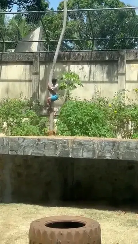 Хлопець спускається до вольєра левиці / © Соцмережа X